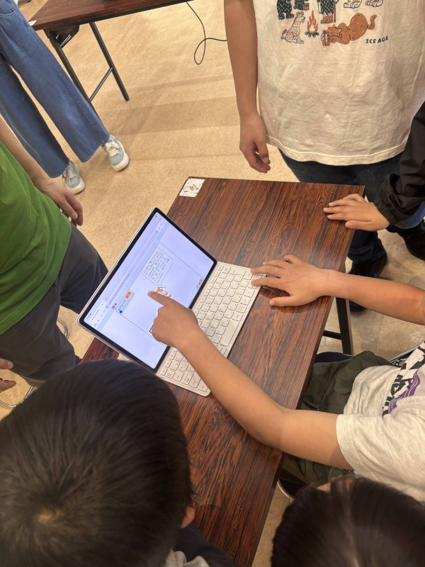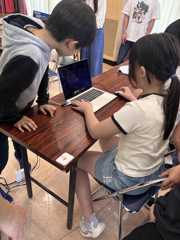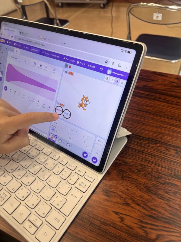 Scratchで大作に挑戦しているニンジャもおり、作品を少しずつ膨らませていく難しさは、大人でもなかなか大変だと感じました。別のニンジャはScratchで対戦ゲームを制作。武器を連続使用できないようにする工夫として、変数のフラグではなく、状態が変化するスプライトで制御していたのが印象的でした。